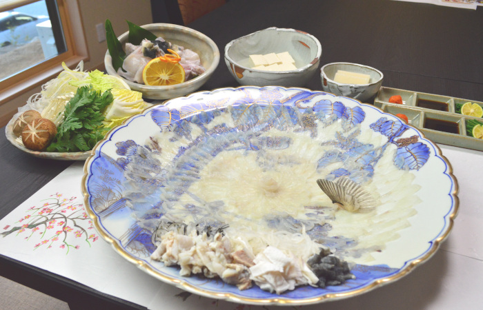 前菜盛り、煮こごり、ふぐ刺し、鍋、雑炊、唐揚げ、白子焼き、デザート。全8品で一人15,000円(税別)で2名から予約可。